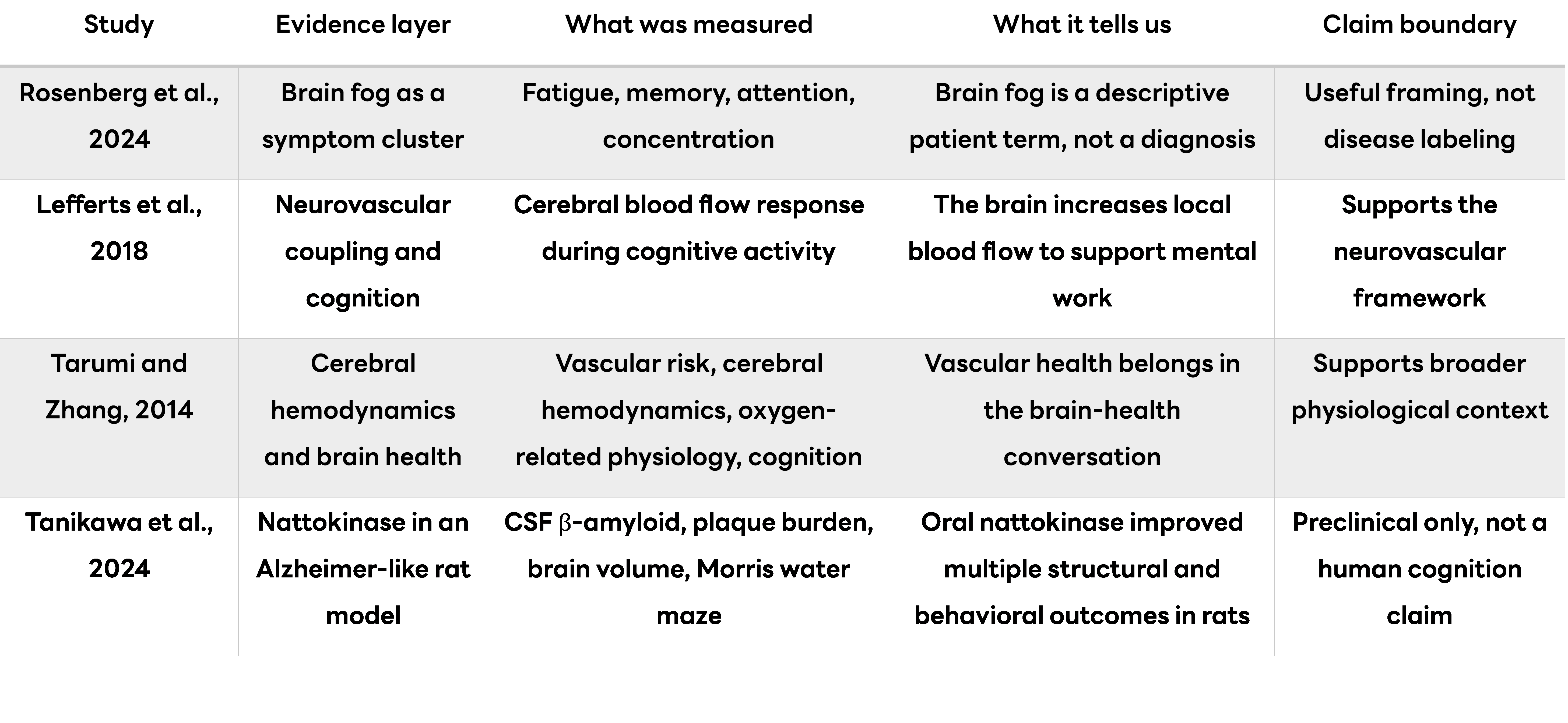 A neurovascular perspective is most useful when the evidence is read in layers. Brain fog itself is not a diagnosis, so the goal is not to force one cause onto a broad symptom cluster. Instead, the literature helps establish three separate but related points: first, what brain fog is; second, why cerebral blood flow is relevant to cognitive function; and third, where nattokinase may enter the conversation without overstating what current data can support.